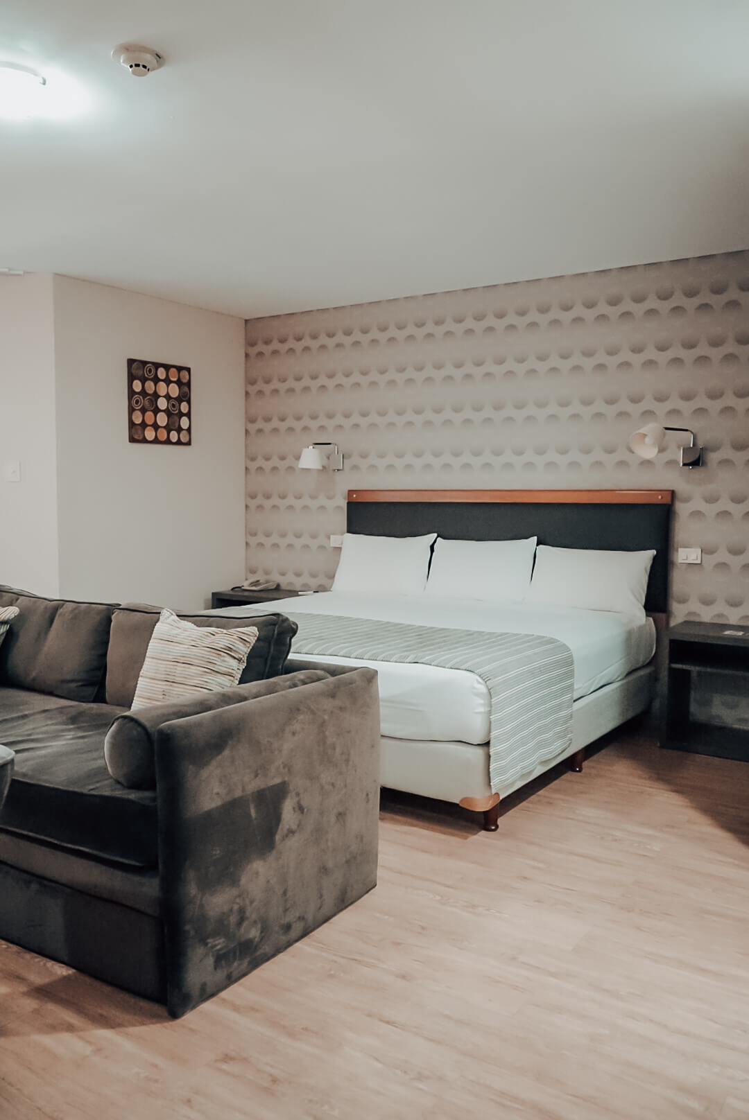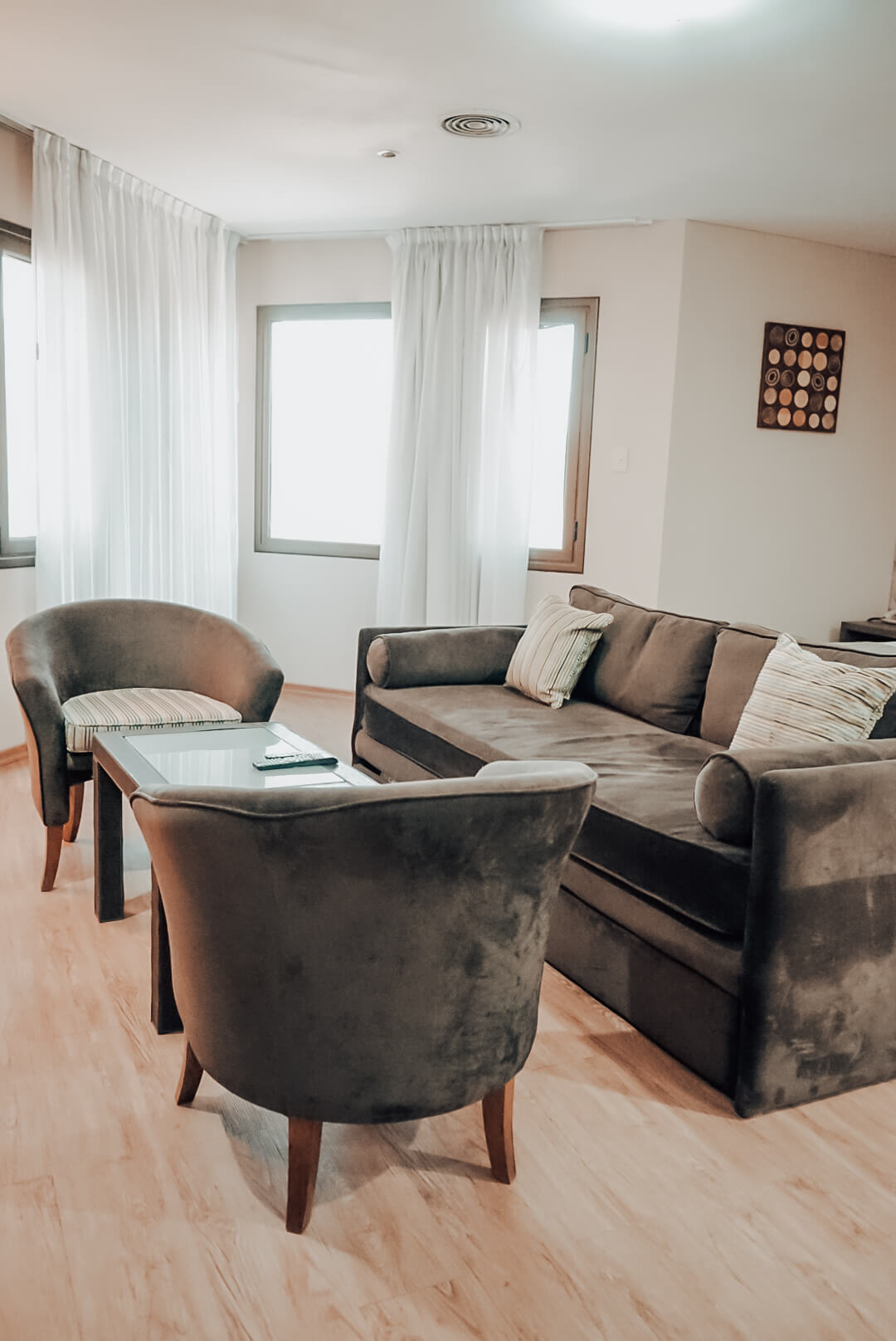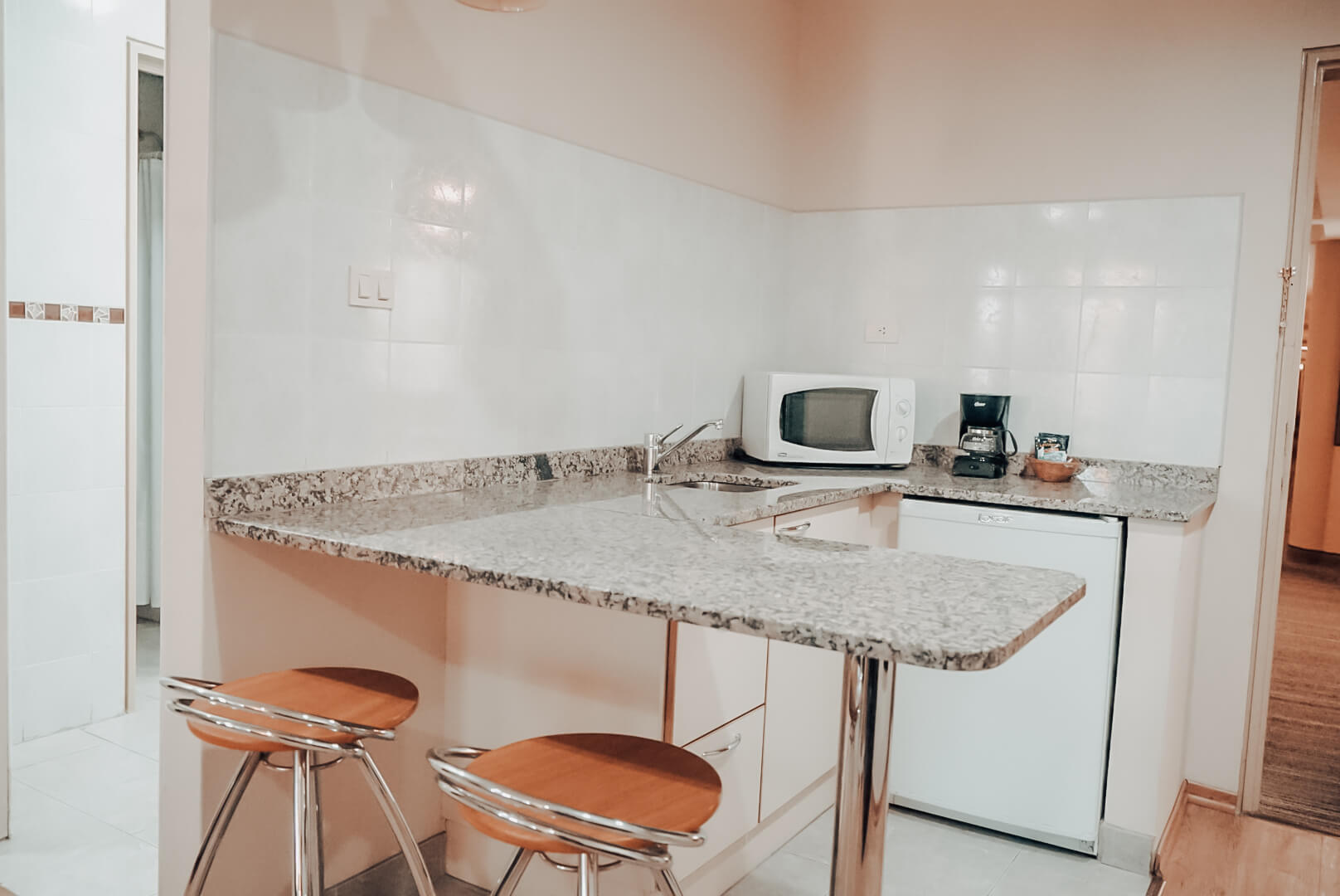 Equipada con Sommier King Size (2mts x 2mts) o 2 (dos) Sommier tamaño full size (1,40x2mts). Además cuenta con kitchenette con frigo bar (sin cargo), vajilla, microondas, cafetera, baño con hidromasaje y amplio escritorio de trabajo, es ideal para estadías prolongadas.